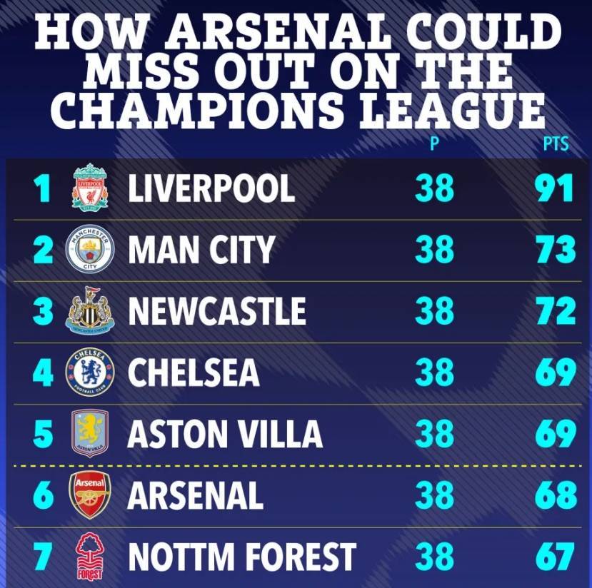 直播吧05月08日讯 太阳报撰文表示,欧冠被淘汰后,阿森纳的噩梦没有结束,他们仍可能无缘下赛季欧冠资格。