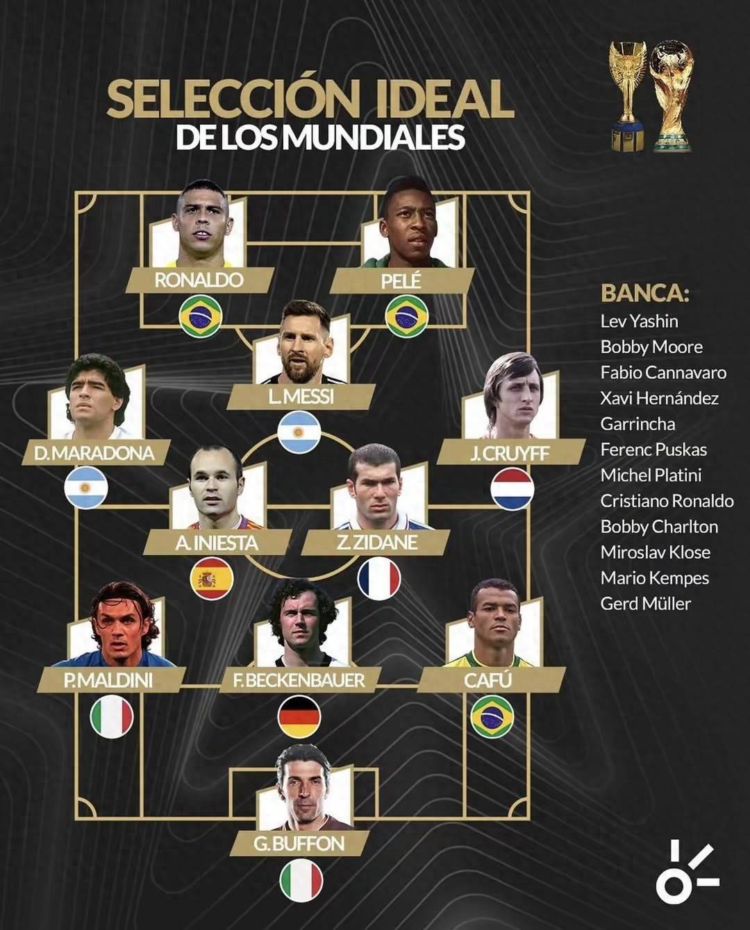2026年美加墨世界杯倒计时进入400天,对此西班牙知名体育账号clarosports特别制作了一支世界杯历史最佳阵容,诸多传奇巨星齐聚一堂,有梅西无C罗,巴西双锋突前,球迷称实至名归!