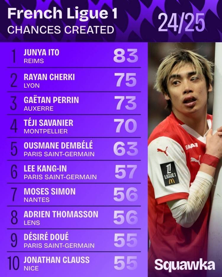 其中效力于兰斯的日本快马伊东纯也以83次位居榜首,切尔基和盖坦-佩兰分别以75次和73次位列二三位,登贝莱63次排在第5,李刚仁57次排第6。