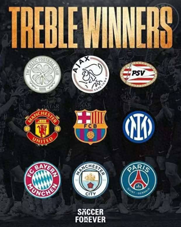 巴黎:2024-25赛季,队史1个欧冠。曼城:2022-23赛季,队史1个欧冠。拜仁:2012-13赛季和2019-20赛季,队史6个欧冠。国际米兰:2009-10赛季,队史3个欧冠。巴萨:2008-09赛季和2014-15赛季,队史5个欧冠。曼联:1998-99赛季,队史3个欧冠。埃因霍温:1987-88赛季,队史1个欧冠。阿贾克斯:1971-72赛季,队史4个欧冠。凯尔特人:1966-67赛季,队史1个欧冠。皇马虽然队史15次夺得欧冠冠军,但从来没有获得过三冠王,在1957年、1959年、2017年、2022年、2024年获得过双冠王,就是欧冠+西甲,或许国王杯就是皇马的难题!